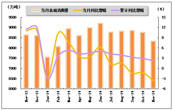 图 9 2013年11月-2014年11月钢材表观消费量及同比增长趋势