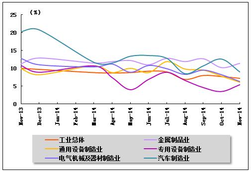 图 7 2013年11月-2014年11月主要耗钢工业行业增加值增长趋势