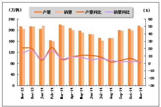 图 6 2013年11月-2014年11月我国汽车各月产销量同比增长趋势比较
