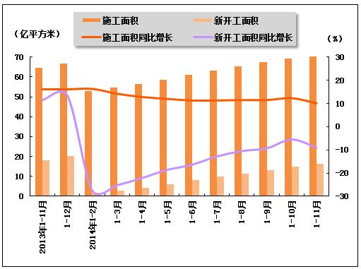 图 5 2013年11月-2014年11月全国房屋累计施工、新开工面积及其同比增长趋势