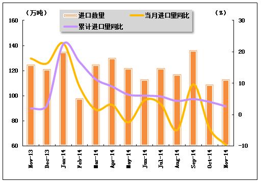 图 13 2013年11月-2014年11月钢材各月进口量及同比比较