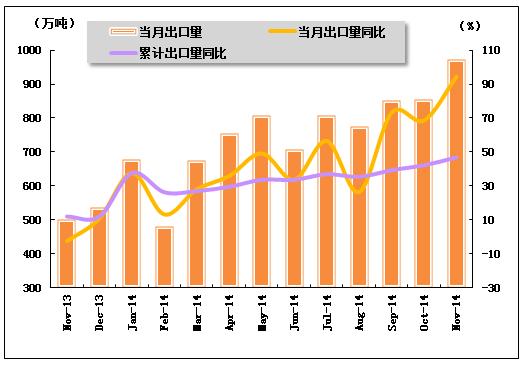 1-11月,我国累计出口钢材8361万吨,同比增长46.8%;其中,11月我国出口钢材972万吨,比10月增加了117万吨,环比增长13.7%。11月份我国钢材出口量出现增长,钢材的外部需求状况有所好转,对加快消化国内过剩库存起到积极作用。