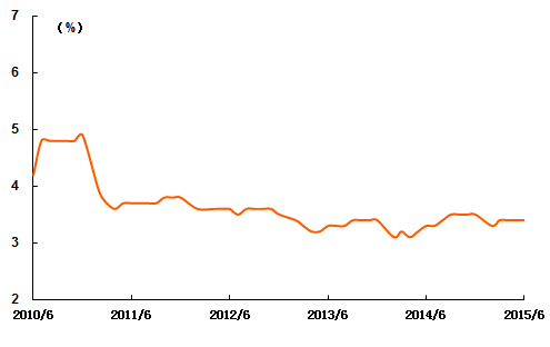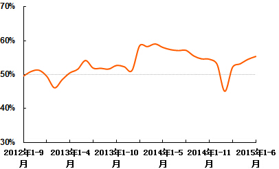 图2 2010年6月-2015年6月电力行业各月累计投资占全国总投资比重走势