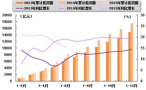 图1 2013-2015年电力行业各月累计固定资产投资额及同比增长变动趋势比较