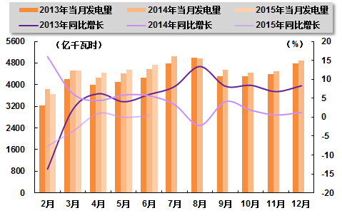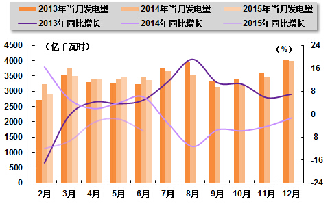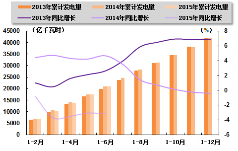 火电生产方面,火电单月、累计发电量持续负增长。国家统计局数据显示,2015年1-6月份,全国累计完成火电发电量20,879亿千瓦时,同比下降3.2%,降幅与2015年1-5月份相比扩大了0.1个百分点,上年同期为同比增长4.7%。其中,6月份,全国共完成火力发电量3,363亿千瓦时,同比下降5.8%,降幅环比扩大了4.1个百分点,上年同期为同比增长6.0%。