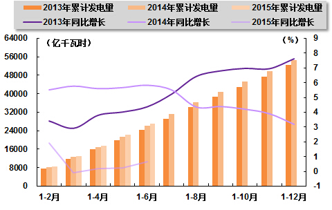 全社会累计发电量同比微增,单月发电量增速重新实现正增长。国家统计局数据显示,2015年1-6月份,全国规模以上发电企业累计完成发电量27,091亿千瓦时,同比增长0.6%,增速和1-5月份相比提高0.4个百分点,与上年同期相比回落5.2个百分点。其中,6月份,全国规模以上发电企业发电量4,745亿千瓦时,同比增长0.5%,与上年同期相比回落5.2个百分点,上月为同比下降0.1%。