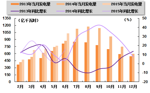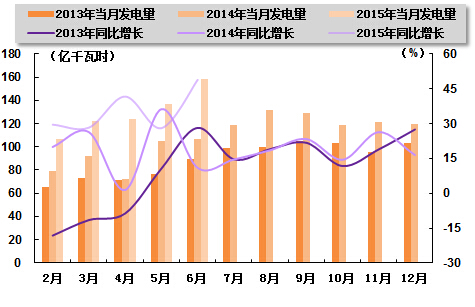 图6 2013-2015年各月总发电量及同比增长率变动趋势比较
