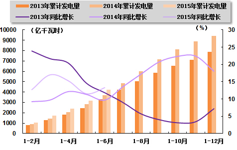 风电发电方面,受益来风好于上年同期,风电发电量增速明显提高。2015年1-6月份,风电累计完成发电量990亿千瓦时,同比增长26.2%,增速与2015年1-5月份相比提高3.5个百分点,与上年同期相比提高14.2个百分点;其中,6月份,风电发电量151亿千瓦时,同比增长49.9%,增速环比提高40.1个百分点,上年同期为下降4.0%。