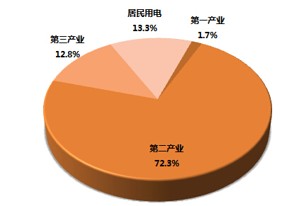 从各产业用电情况来看,第一产业用电量微升,占全社会用电量比重与去年同期持平;第二产业用电量需求依旧偏弱,占全社会用电量的比重同比继续下降;第三产业和居民用电量增速较1-5月略有放缓,但总体仍保持较快增长,成为带动全社会用电量增速提升的主要动力,占全社会用电量的比重同比继续提高。国家能源局数据显示,2015年1-6月份,第一产业用电量441亿千瓦时,同比增长0.9%,上年同期为下降了4.6%。第二产业用电量19,242亿千瓦时,同比下降0.5%,上年同期为增长5.1%。第三产业用电量3,397亿千瓦时,同比增长8.1%,增速与上年同期相比提高1.2个百分点。城乡居民生活用电量3,545亿千瓦时,同比增长4.8%,增速与上年同期相比回落1.8个百分点。第一、第二、第三产业及城乡居民生活累计用电量分别占全社会用电量的比重为1.7%、72.3%、12.8%、13.3%,与上年同期相比,第一产业与去年同期持平,第二产业占比下降1.2个百分点,第三产业和城乡居民生活用电量占比分别提高0.9和0.4个百分点。