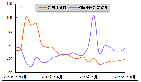 图 3 2013年11月-2015年8月医药行业利用外资合同项目数和金额增速走势