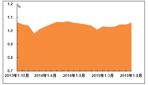 2015年以来,受GMP升级推动的医药行业投资高峰已经过去,2015年4月以来医药行业投资增速明显放缓。进入8月份,医药行业投资增速较6、7月份略有回升,但仍低于10%。国家统计局数据显示,2015年1-8月,医药行业完成投资额3591.0亿元,同比增长9.9%,增速较2015年1-7月增长了0.7个百分点,比上年同期下降6.9个百分点;医药行业投资额占同期全国总量的1.1%,占比与上年同期持平。