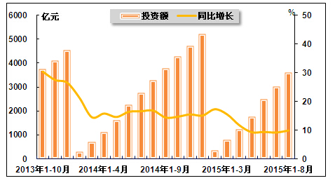 图 1 2013年10月-2015年8月医药行业投资额及其增速走势