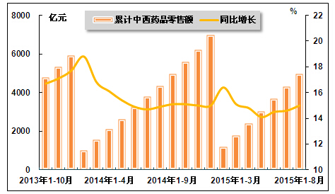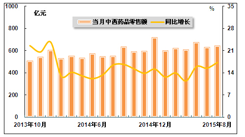 国家统计局数据显示,2015年8月,中西药品零售额为645亿元,同比增长17.3%,增速较上年同期提高0.8个百分点,较上月提高1.8个百分点;2015年1-8月,中西药品零售额为4960亿元,同比增长15%,增速较2015年1-7月和上年同期分别提高0.4和0.1个百分点。