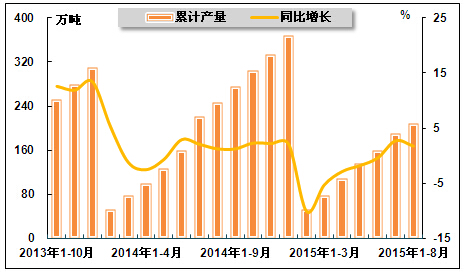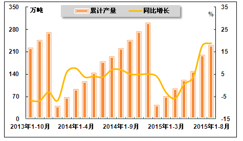 图7 2013年10月-2015年8月化学药品原药产量及其增速走势