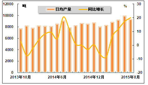图6 2013年10月-2015年8月化学药品原药日平均产量及其增速走势