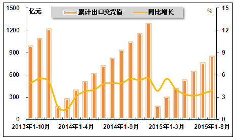 图 14 2013年10月-2015年8月医药行业累计出口交货值及其增速走势