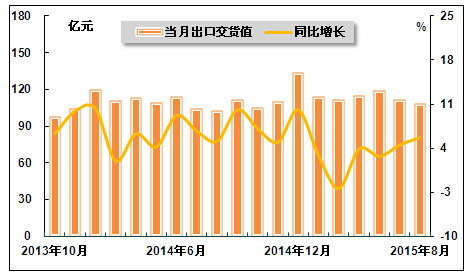 图 13 2013年10月-2015年8月医药行业单月出口交货值及其增速走势