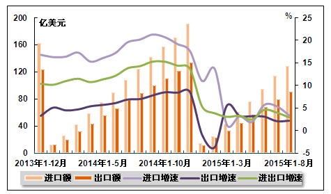图 12 2013年12月-2015年8月医药品进出口额及其增速走势
