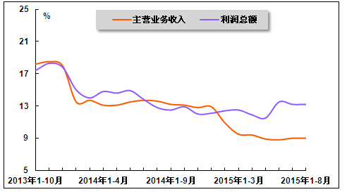 2015年8月,在度过医改红利时代后,医药行业主营业务收入和利润总额已逐步回归稳定增长。国家统计局数据显示,2015年1-8月,医药行业实现主营业务收入15820.9亿元,同比增长9.0%,增速与2015年1-7月持平,较上年同期下降4.6个百分点;同期,医药行业实现利润总额1571.5亿元,同比增长13.2%,增速与2015年1-7月持平,较上年同期提高0.4个百分点。