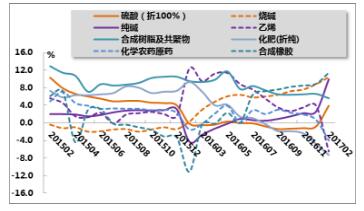 图7 2015年2月-2017年2月我国主要化工产品累计产量同比增速