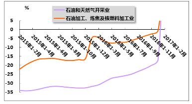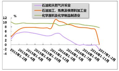 国家统计局数据显示,2017年1-2月我国油气开采业增加值累计同比下降2.1%,较2016年1-12月扩大2.0个百分点,而上年同期为同比增长5.0%;2017年1-2月石油加工业增加值累计同比增长0.1%,增速较2016年1-12月及上年同期分别回落6.6、11.1个百分点;2017年1-2月化学原料及化学制品制造业增加值累计同比增长5.2%,增速较2016年1-12月及上年同期分别回落2.5、3.4个百分点。