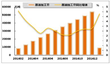 图5 2016年2月-2017年2月我国原油累计加工量及同比增长率
