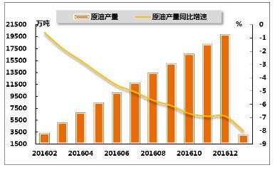 受油价低位运行及原油产量过剩影响,我国原油生产持续低迷。国家统计局数据显示,从累计数据来看,2017年1-2月,我国原油累计产量达3144.4万吨,同比下降8.0%,降幅较2016年1-12月及上年同期分别扩大1.1、7.4个百分点;2017年1-2月,原油累计加工量为9076.5万吨,同比增长4.3%,增速较2016年1-12月提高1.5个百分点,较上年同期回落0.3个百分点。