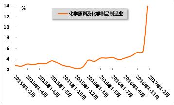 2017年2月,化学原料及化学制品制造业主营业务收入增速保持稳定。国家统计局数据显示,2017年1-2月,化学原料及化学制品制造业实现主营业务收入13349.8亿元,同比增长18.4%,增速较2016年1-12月提高12.8个百分点,较上年同期提高15.9个百分点。