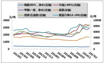 图12 2015年2月-2017年2月我国部分化工产品月平均价格走势