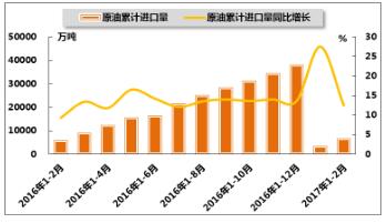 图14 2016年2月-2017年2月同期我国原油累计进口量及同比增长率