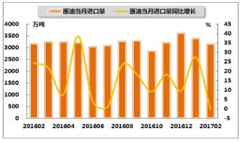 图13 2016年2月-2017年2月我国原油当月进口量及同比增长率