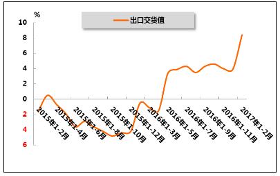 图17 2015年2月-2017年2月化学原料及化学制品制造业出口交货值累计同比增速
