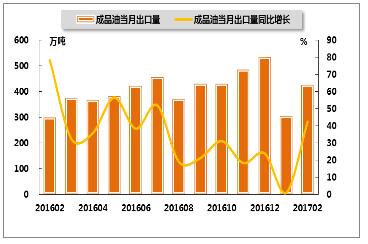 图16 2016年2月-2017年2月我国成品油当月出口量及同比增长率