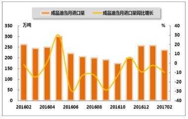 图15 2016年2月-2017年2月我国成品油当月进口量及同比增长率