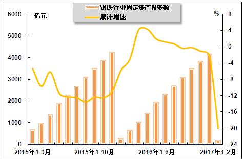 图1 2015年3月-2017年2月钢铁行业累计固定资产投资额及增速走势