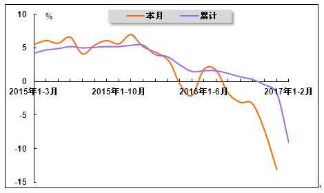 2017年2月,钢铁去产能、环保监管等政策持续发力,受春节假期以及钢企限产等综合影响,钢铁行业工业增加值延续负增长态势,且降幅不断扩大。国家统计局数据显示,2017年1-2月,我国钢铁行业工业增加值累计同比下降9.1%,降幅较上年全年扩大7.4个百分点,而上年同期为同比增长4.0%。