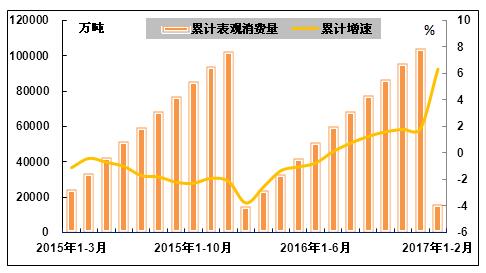 图8 2015年3月-2017年2月钢材累计表观消费量及增速走势