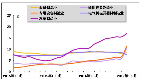 2017年2月,主要耗钢工业增加值继续快速增长,五大耗钢工业中除电气机械及器材制造业外,其他行业增速均有所加快,对钢铁需求形成有力支撑。国家统计局数据显示,2017年1-2月,金属制品业、通用设备制造业、专用设备制造业、电气机械及器材制造业、汽车制造业增加值累计增速分别为8.4%、10.6%、11.5%、7.5%、17.0%,与上年全年相比,电气机械及器材制造业下降1.0个百分点,金属制品业、通用设备制造业、专用设备制造业和汽车制造业分别上升0.2、4.7、4.8和1.5个百分点。与上年同期相比,电气机械及器材制造业下降0.7个百分点,金属制品业、通用设备制造业、专用设备制造业和汽车制造业分别上升0.2、6.7、8.0和8.9个百分点.
