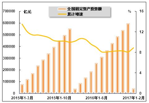 图4 2015年3月-2017年2月全国固定资产投资累计完成额及增速走势