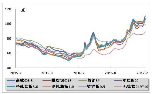 图10 2015年2月-2017年2月主要品种钢材价格指数走势