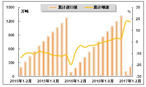 图12 2015年2月-2017年2月钢材累计进口量及增速走势