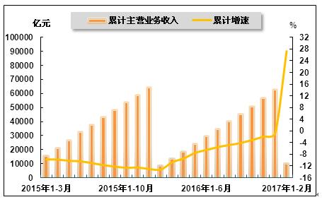 2017年2月,得益于市场需求回暖以及钢铁价格持续上升,钢铁行业主营业务收入止跌反弹,累计增速大幅回升,自2014年11以来首次转负为正。国家统计局数据显示,2017年1-2月,钢铁行业累计实现主营业务收入10,388.1亿元,同比增长27.3%,而上年全年为同比下降0.7%,上年同期为同比下降13.2%。