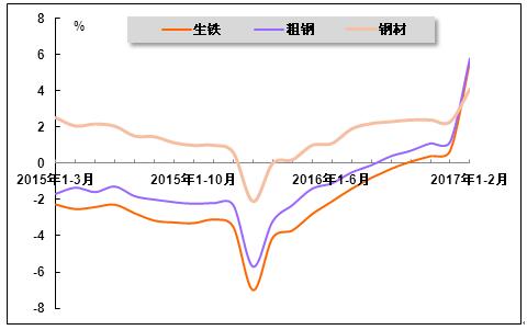 图3 2015年3月-2017年2月主要钢铁产品产量累计增速走势