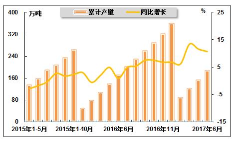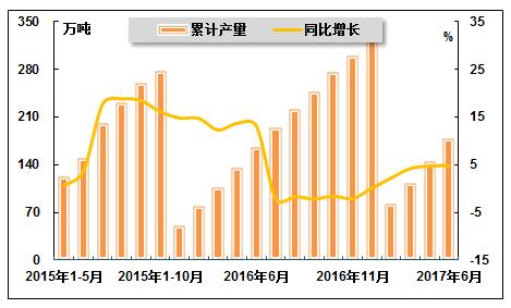 图5 2015年5月-2017年6月化学药品原药产量及其增速走势