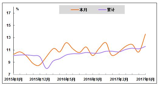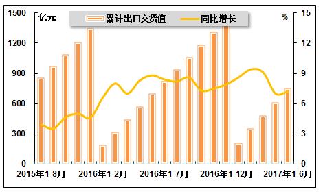图 12 2015年8月-2017年6月医药行业累计出口交货值及其增速走势