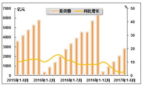 图 1 2015年8月-2017年6月医药行业投资额及其增速走势