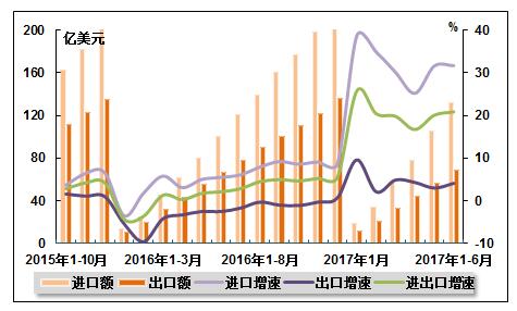 进入2017年,全球经济贸易仍处于深度调整期,主要经济体需求不振、新兴市场动力不足、价格竞争日趋激烈,我国医药外贸发展也还处于中低速增长期,面临的困难依然较多。但随着近年来我国医药出口结构进一步优化,企业国际化步伐加快,新的发展动能正在积聚,医药外贸整体呈现继续回稳向好的态势。海关总署数据显示,2017年1-6月,医药行业进出口总值为201.7亿美元,同比增长20.8%,增速较上年同期提高18.7个百分点。其中,出口额69.2亿美元,同比增长4.1%,而上年同期为同比下降2.5%;进口额132.4亿美元,同比增长31.7%,增速较上年同期提高26.2个百分点;贸易逆差63.2亿美元,较上年同期扩大29.4亿美元。