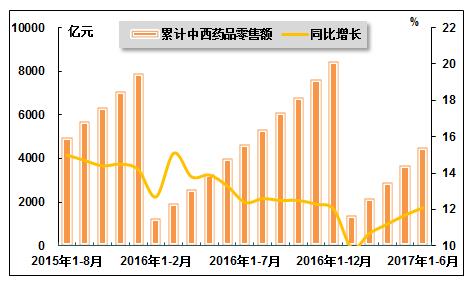 随着新医改的推进,医保控费越来越严、医院药占比越来越小、药品招标降价和辅助用药、抗生素、大输液等限制力度加大等,特别是随着医保控费的全面展开,打破了医药行业依赖医保扩张的传统增长模式,行业零售额增速明显低于上年同期。国家统计局数据显示,2017年1-6月,中西药品零售额为4506.0亿元,同比增长12.17%,增速较上年同期下降1.2个百分点。