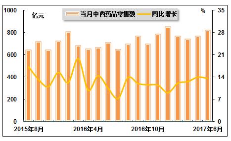 图 8 2015年8月-2017年6月中西药品单月零售总额及其增速走势