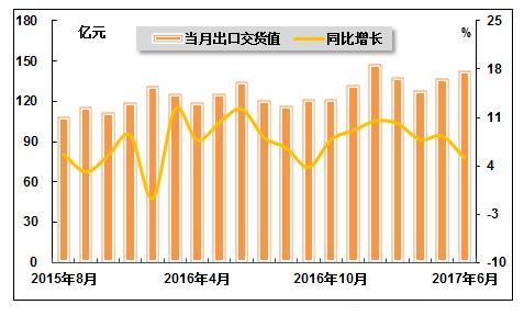 图 11 2015年8月-2017年6月医药行业单月出口交货值及其增速走势